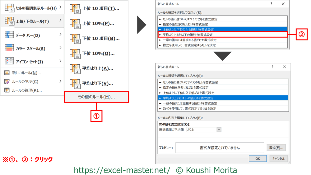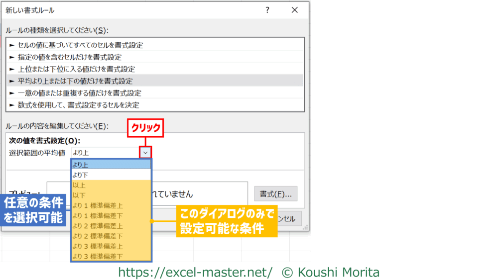 - 平均より上または下の値だけを書式設定:平均より上、平均より下