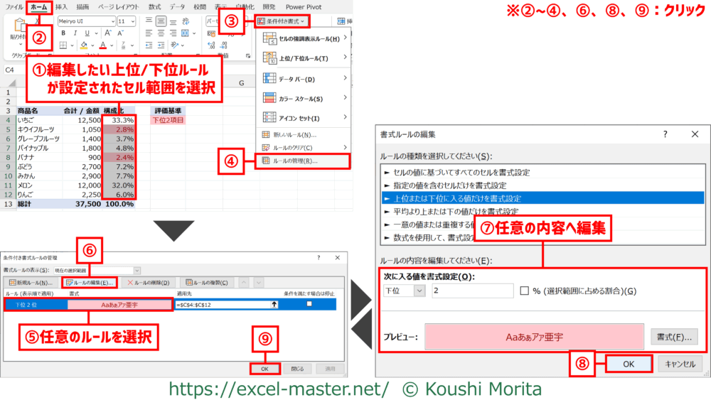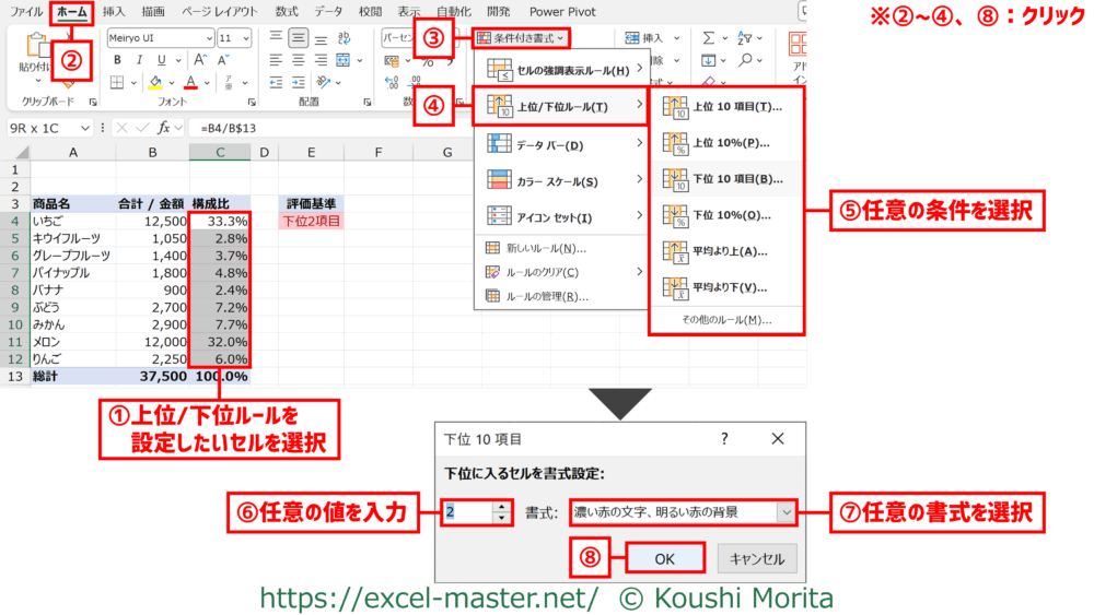 手順①のセル範囲に総計/小計等を含めないことを推奨(含めると上位/下位の判定に影響するため)。
