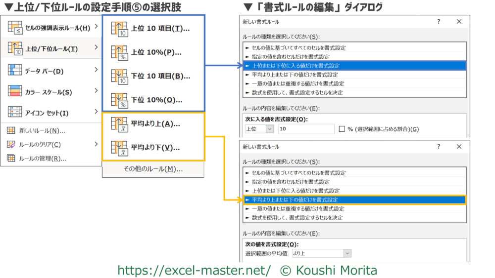 上位/下位ルールの設定手順⑤の選択肢により、「書式ルールの編集」ダイアログ上のルールの種類が異なります。