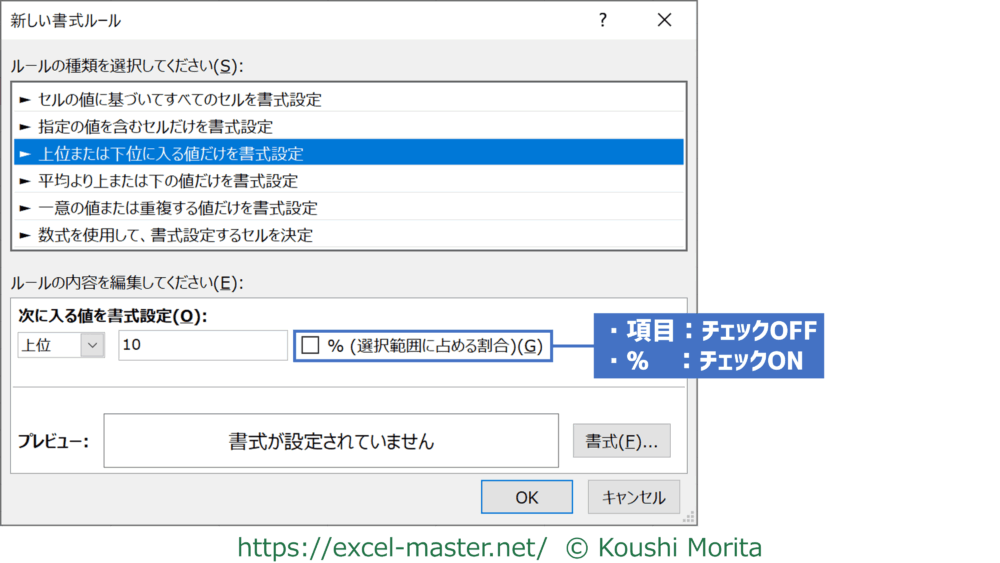 「書式ルールの編集」ダイアログ上のルールの種類「上位または下位に入る値だけを書式設定」で、後から上位/下位の「項目」↔「%」を切り替えたい場合は、「%(選択範囲に占める割合)」のチェックのON/OFFを切り替えましょう。