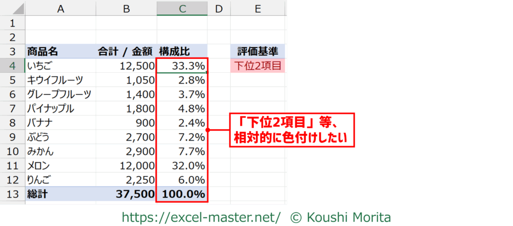 こうした基準でセルを色付けする場合、データによって上位/下位の数値は変動するため、手作業だと対象のセルを特定することが大変です。