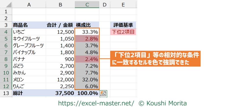 この後、データによって「構成比」列の数値の大小が変わったとしても、それに合わせて書式も自動で反映されます。