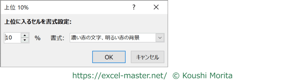 なお、条件名に「10」とありますが、この数値は「上位10%」ダイアログにて変更可能です。