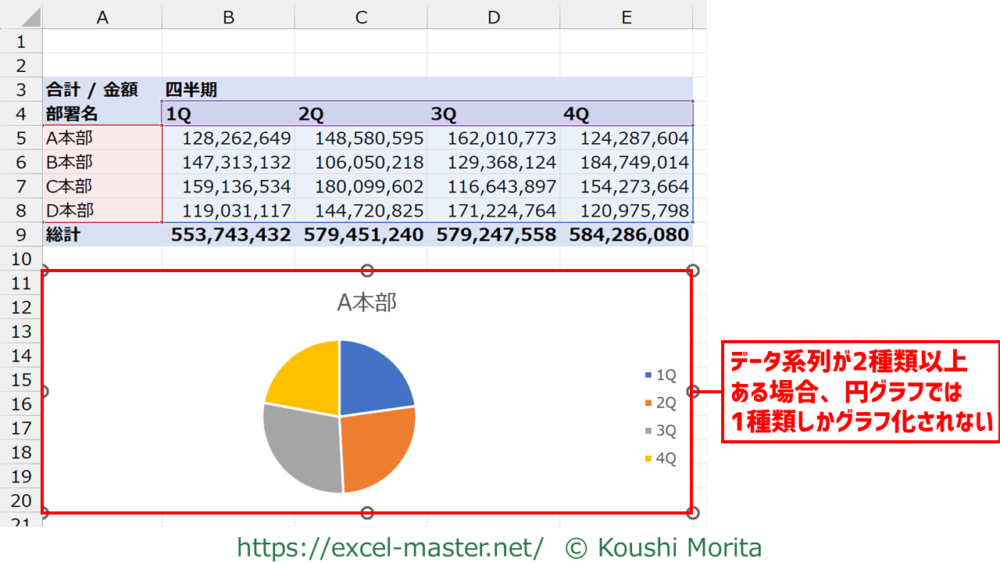 しかし、円グラフは複数のデータ系列を元データにすると、一部のデータ系列しかグラフ化してくれません。