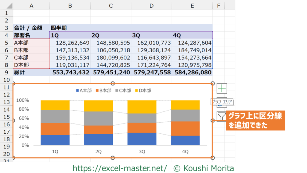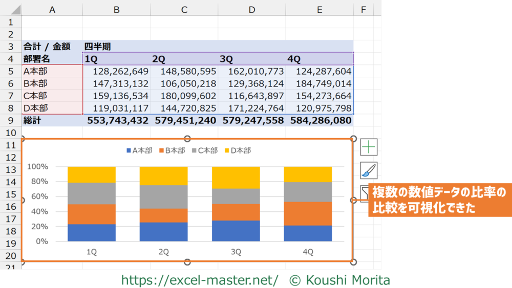 四半期ごとに各本部の売上金額の構成比をグラフで可視化できました。