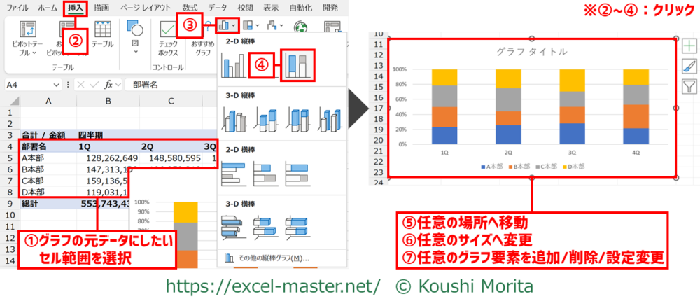 100%積み上げ縦棒グラフを挿入/設定したい場合は、以下の手順となります。