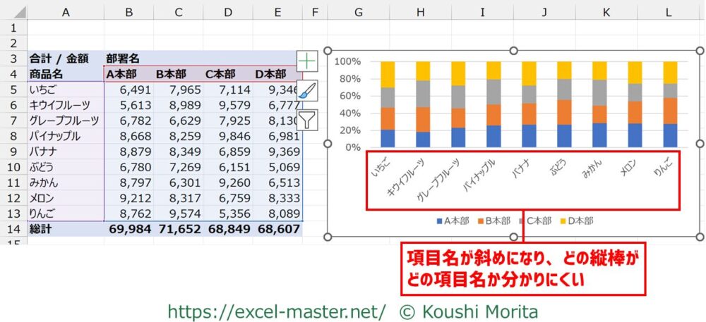 Excelで100%積み上げ縦棒グラフを作成しましたが、横軸の項目名が長くてちょっと斜めになってしまいます。。