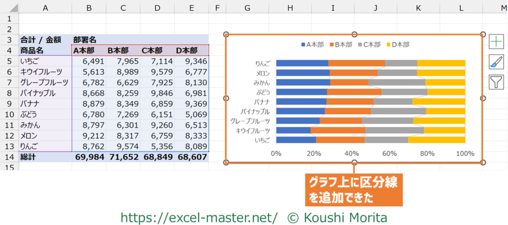 表に総計や小計の行/列がある場合、手順①のセル範囲に総計/小計を含めないことを推奨(含めると横棒を積み上げた結果が総計にならないため)。