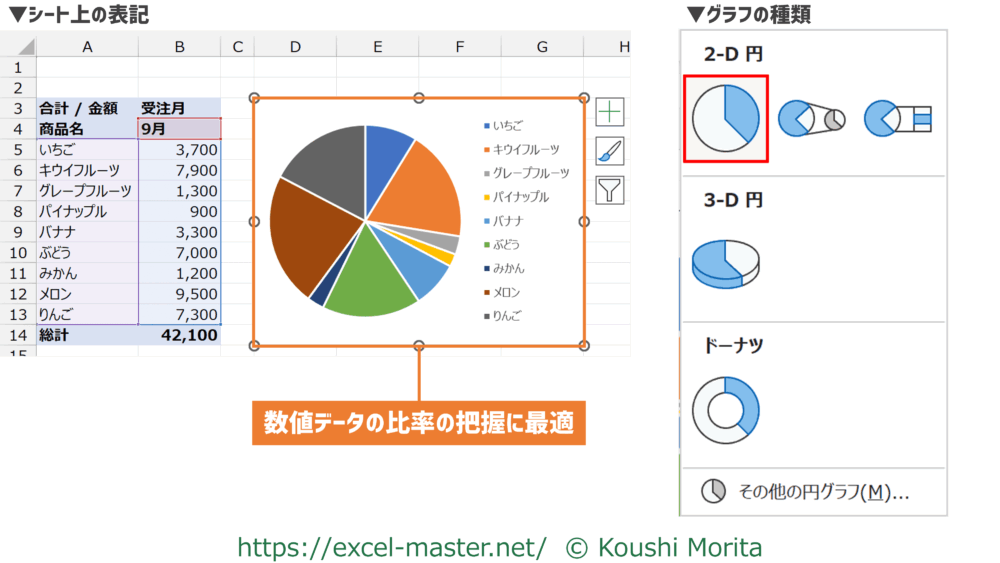 円グラフは、構成比等、数値データの「比率」の把握に最適です。