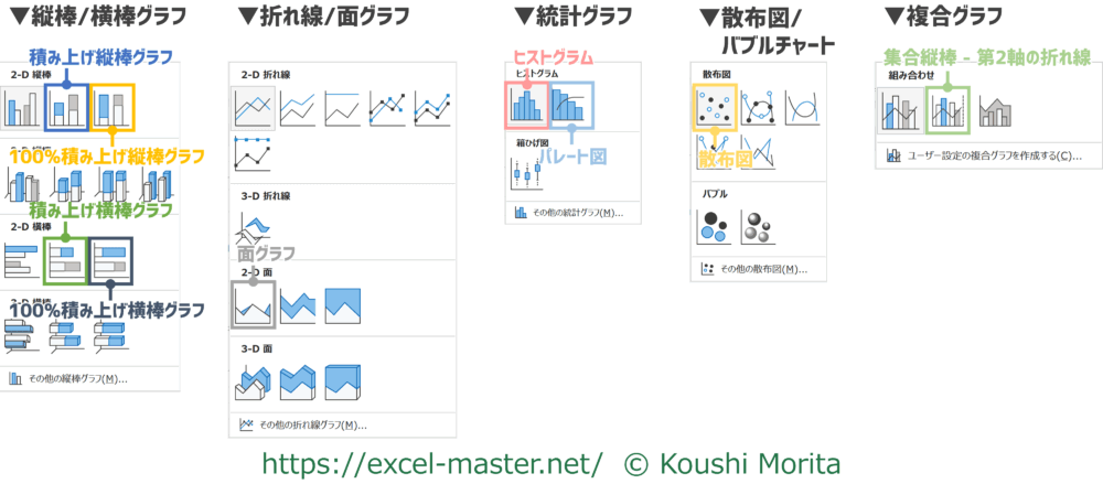 他にも様々なグラフが用意されていますが、上記を使い分けできるだけでも十分でしょう。