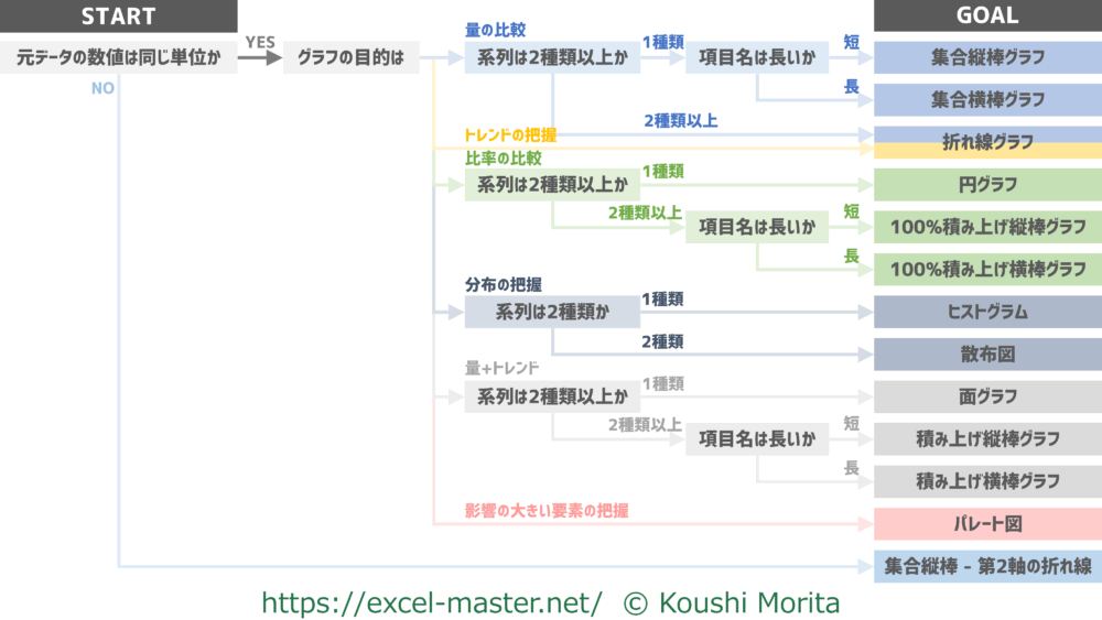 前述のグラフ種類をどのように使い分けすれば良いか、以下のチャートに判断軸を整理してみました。