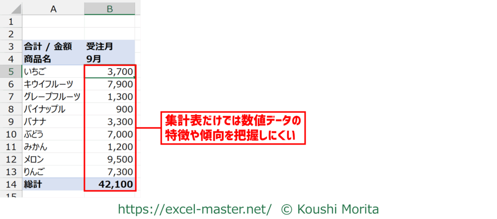 集計表にまとめたデータだけだと、数値の特徴や傾向等の全体感がパッと見で把握しにくいです。