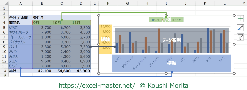 主要なグラフ要素のうち、横軸・縦軸・凡例・データ系列が集計表のどの部分になるか、集合縦棒グラフを例に解説します。