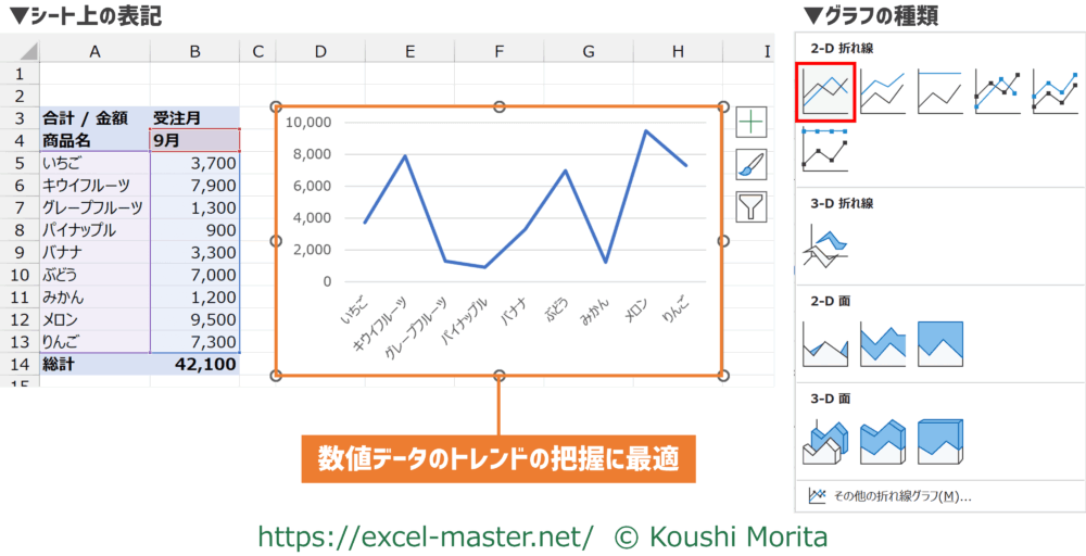 折れ線グラフは、数値データの時系列(年/月/日等)の「トレンド」を把握するのに最適です。