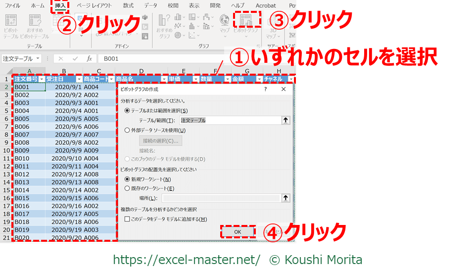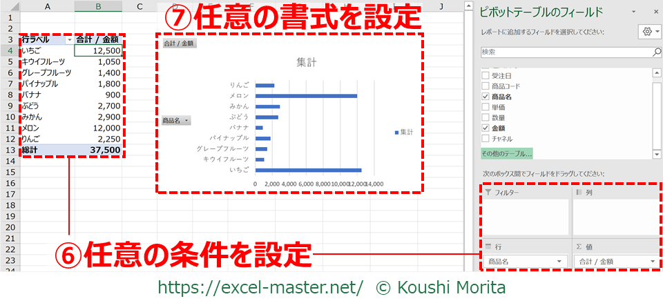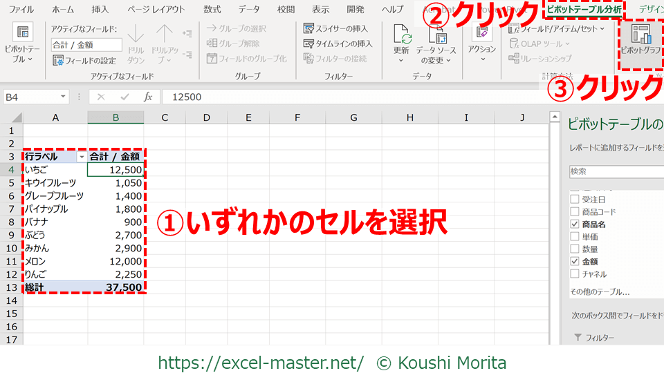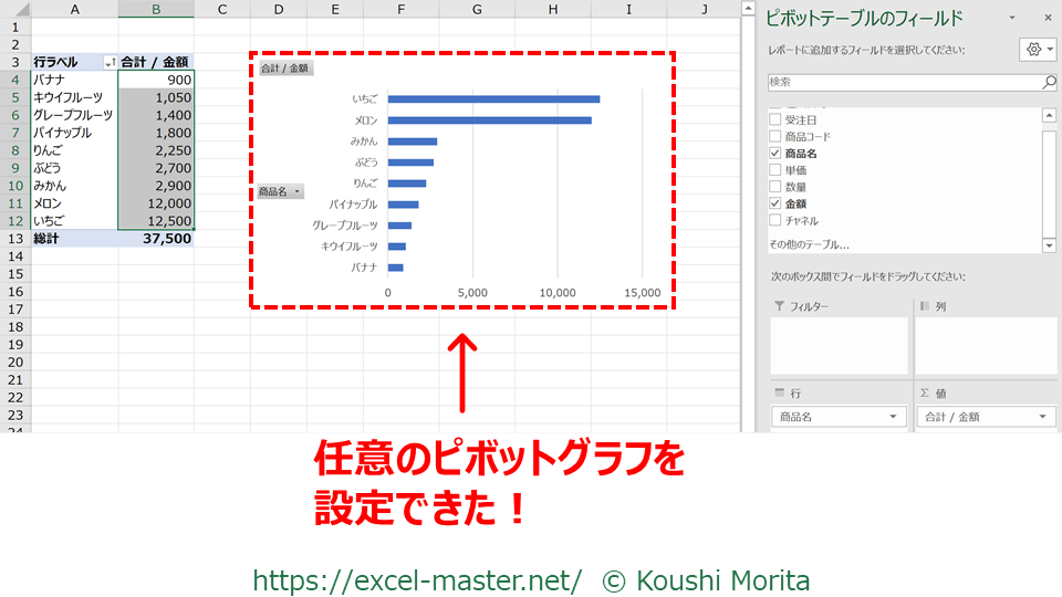 では、ピボットテーブルグラフの設定手順を確認していきましょう。