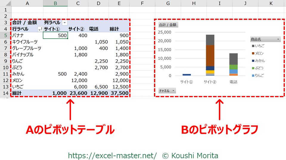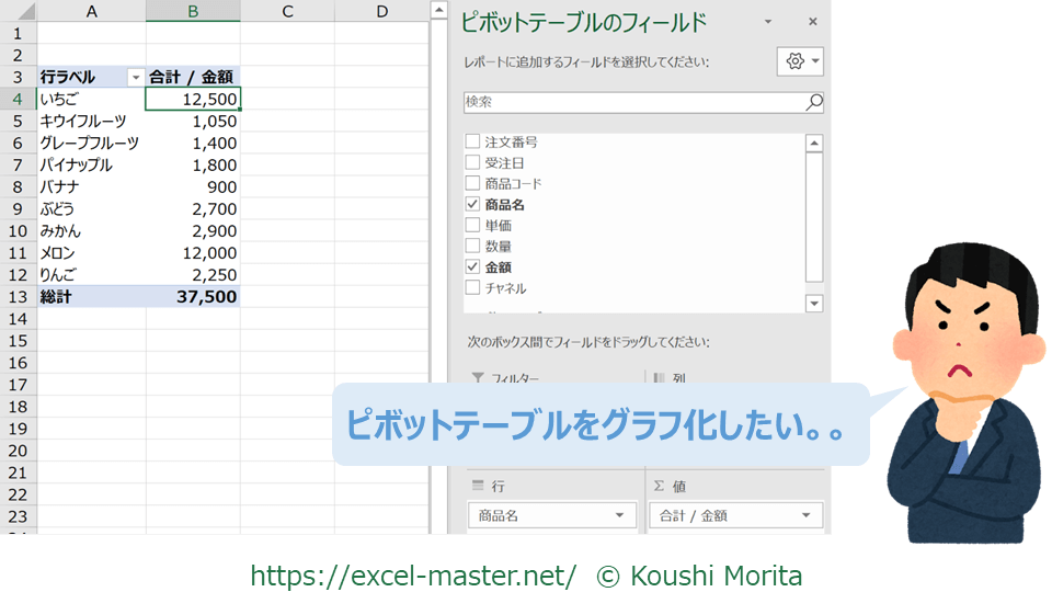 普通の方法だと、ピボットテーブルのサイズが変わった際に対応できないため、「ピボットグラフ」というピボットテーブル用のグラフ機能を使いましょう!