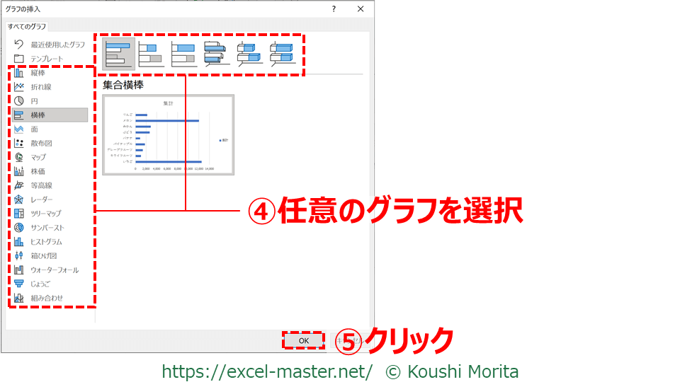 ここで任意のグラフを選択(④)し、「OK」をクリック(⑤)してください。