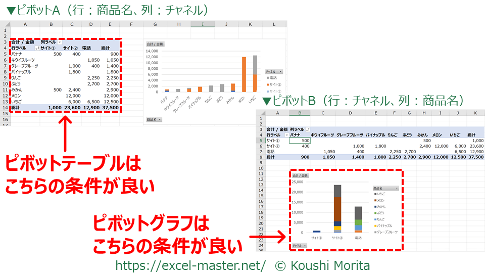 ちょっと面倒ですが、これで別条件のピボットテーブルとピボットグラフを表示可能です。