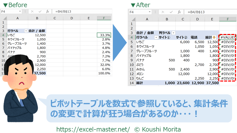 ピボットテーブルレポートを元に数式で構成比を計算していると、参照元がずれることがある