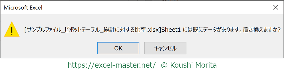 次の警告メッセージ上の「OK」をクリックすると上書きされます。