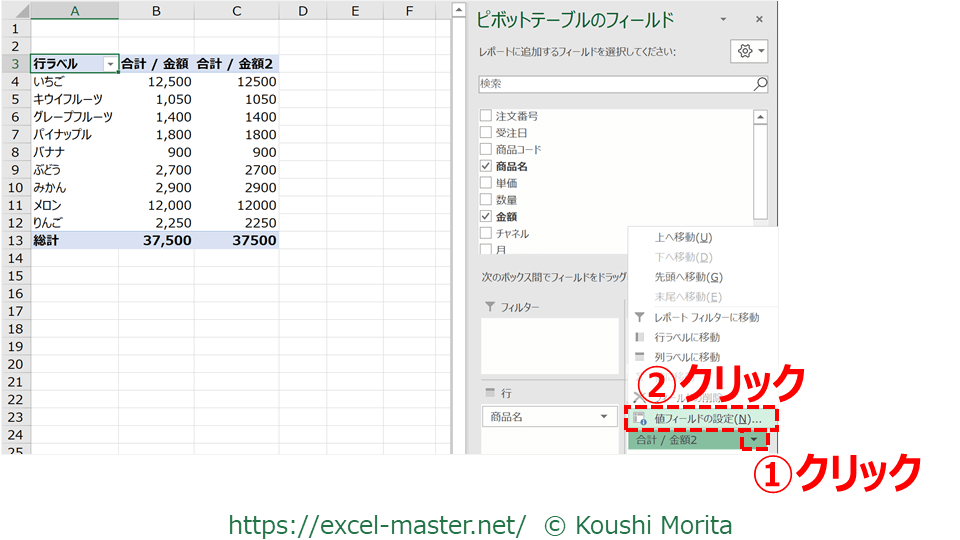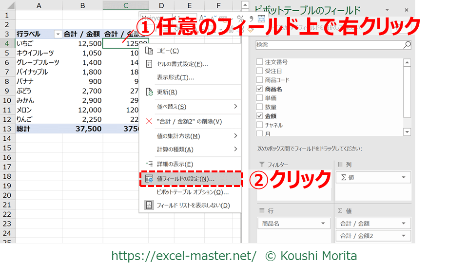 すると、メニューが表示されますので、その中から「値フィールドの設定」をクリック(②)してください。