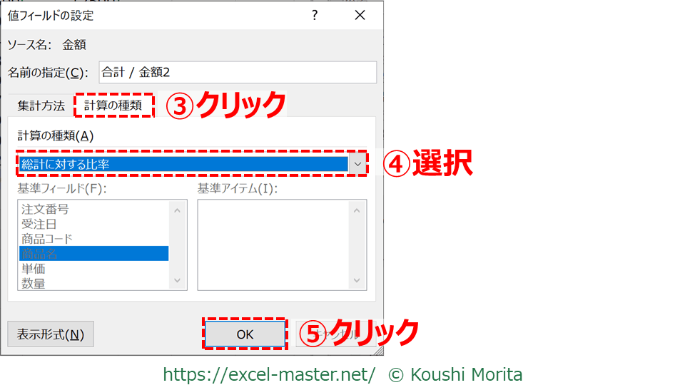 続いて、「計算の種類」のプルダウンから「総計に対する比率」を選択(④)し、「OK」をクリック(⑤)すれば完了です。