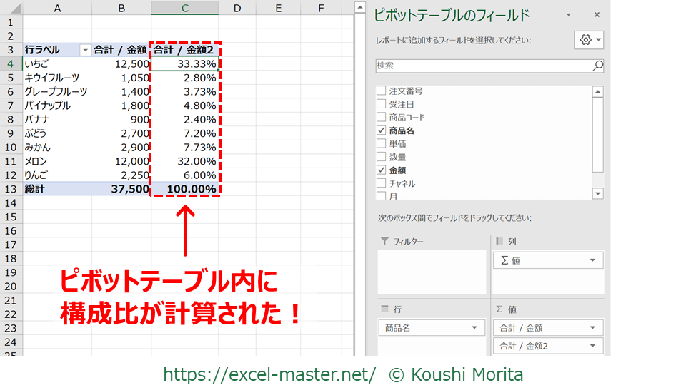 ワークシート上を見ると、設定した「合計/金額2」が構成比で計算されていますね!