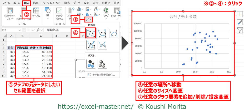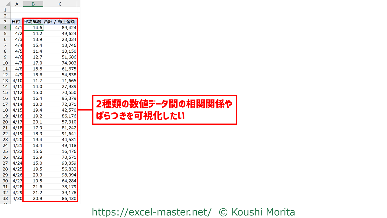 Excelで平均気温と売上等、データ間の相関関係を視覚的に表現したいです。