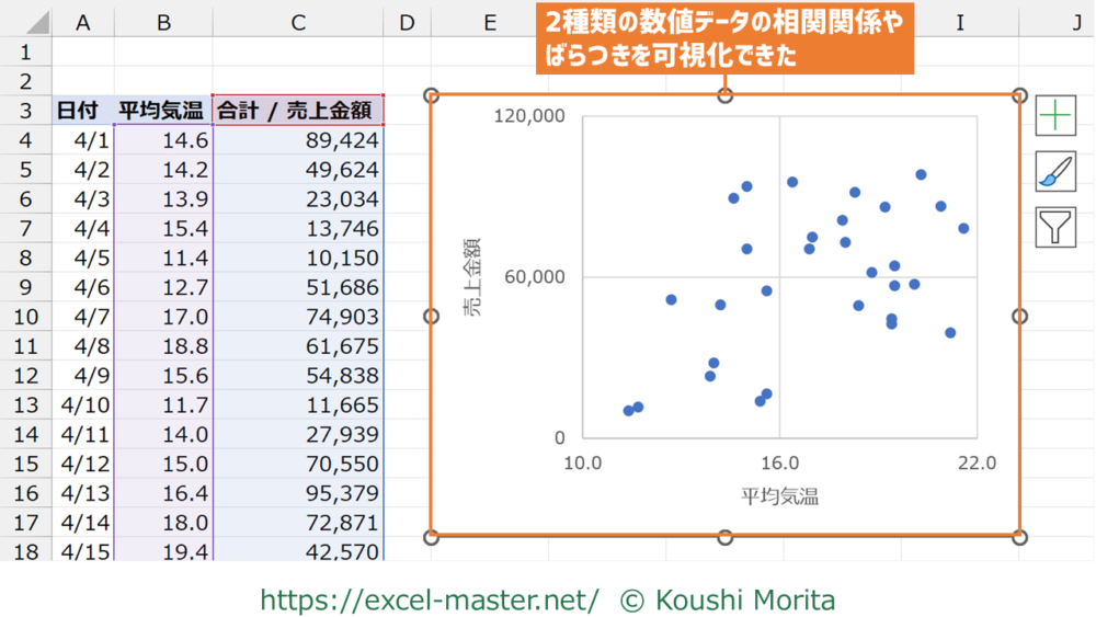 平均気温と売上金額の相関関係やばらつきをグラフで可視化できました。