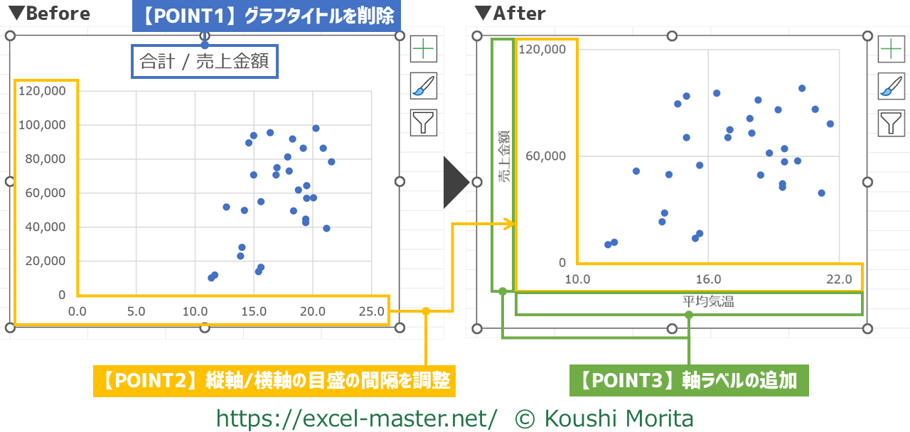 散布図の場合のPOINT2は、縦軸/横軸それぞれ最大値~最小値の間の目盛線を1~2本程度(プロットエリアを4分割または9分割)にすることが目安(After例は4分割)。