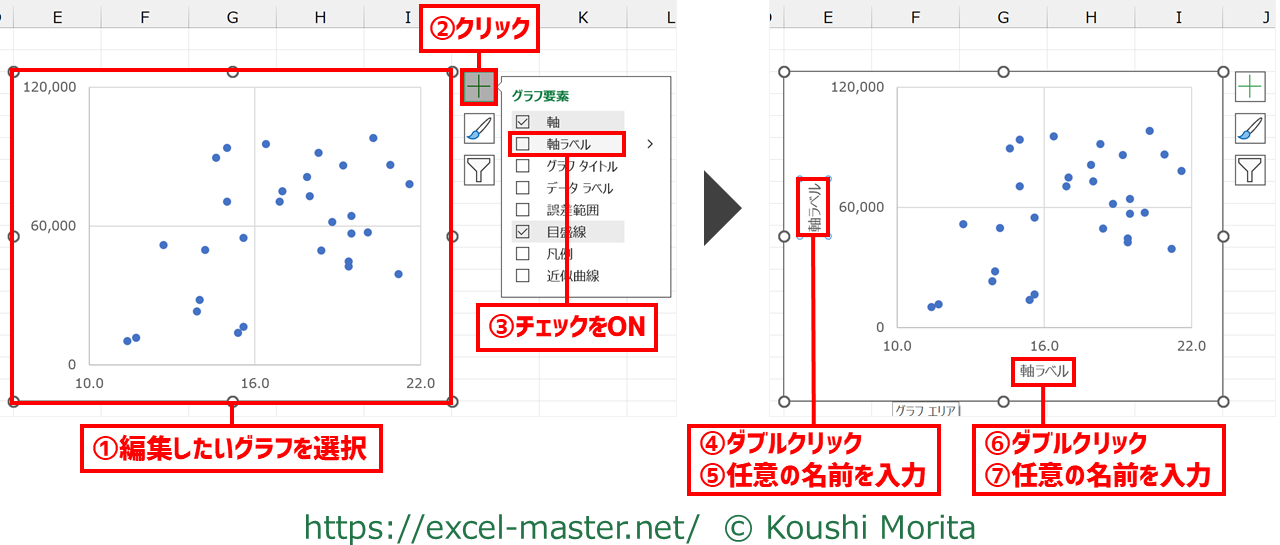 手順④⑥は、軸ラベルを選択→「F2」キー押下でもOK。