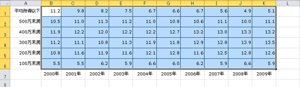 今回のサンプルでは平均所得金額以下の世帯の所得金額階級別にみた構成比を表にしてみました。(累積だったものを階級別の個別比率に修正)