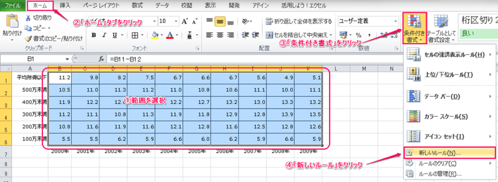 条件付き書式でセルに色分けを行なうことで表をグラフのように視覚的にわかりやすいものにすることが可能です。