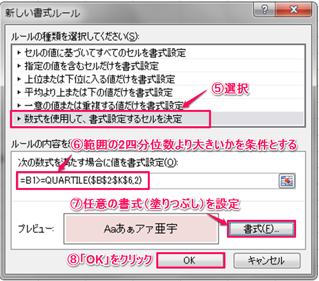 6. 条件の入力ボックスに「=B1>=QUARTILE($B$2:$K$6,2)」を入力(範囲の第2四分位数(=中央値)以上かが条件)