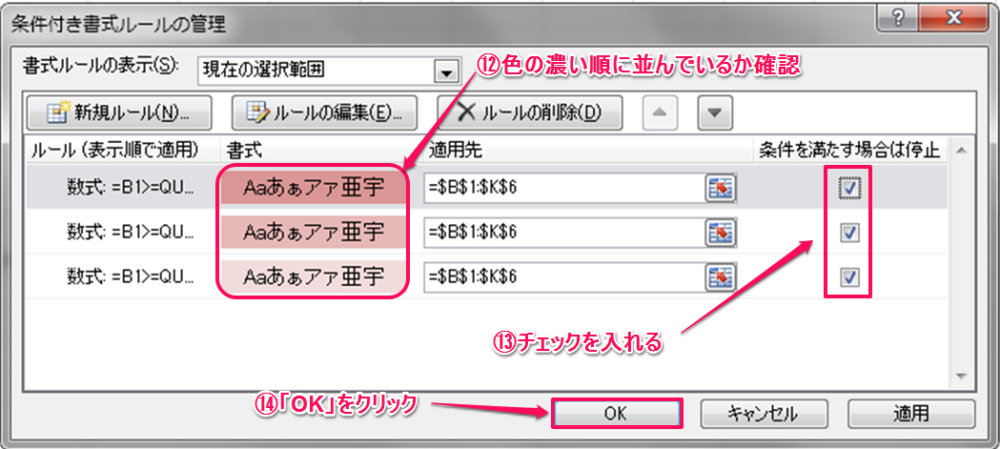 12.で並びが異なる場合は「ルールの削除」の右側にある矢印のボタンで調整します。