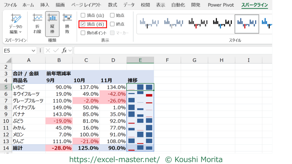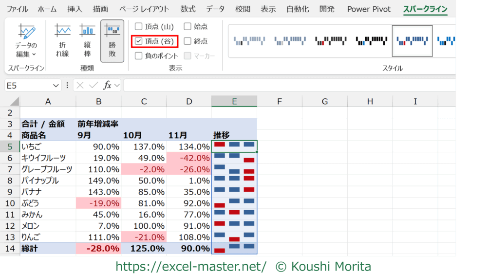 そんな場合、リボン「スパークライン」タブにある「表示」グループで任意のポイントを強調できますよ!