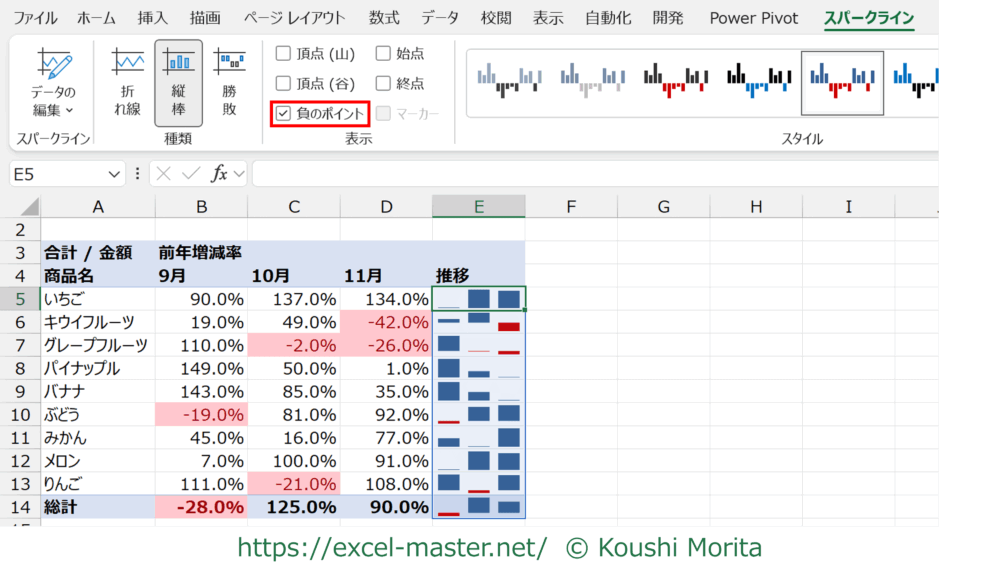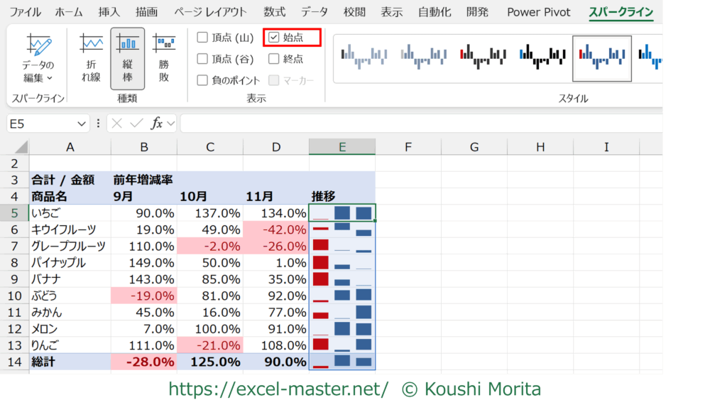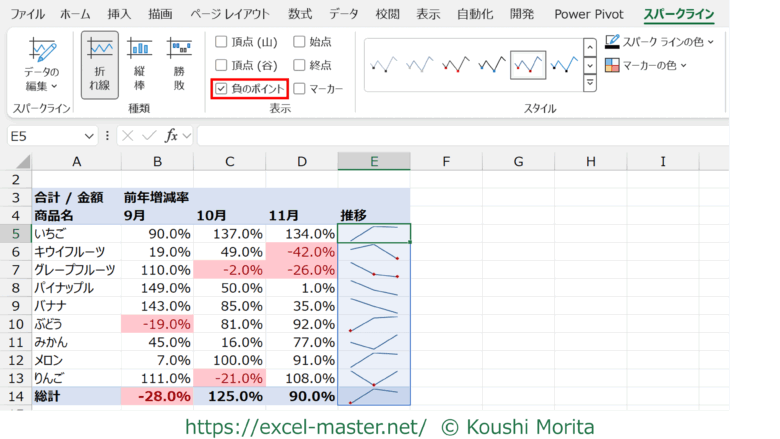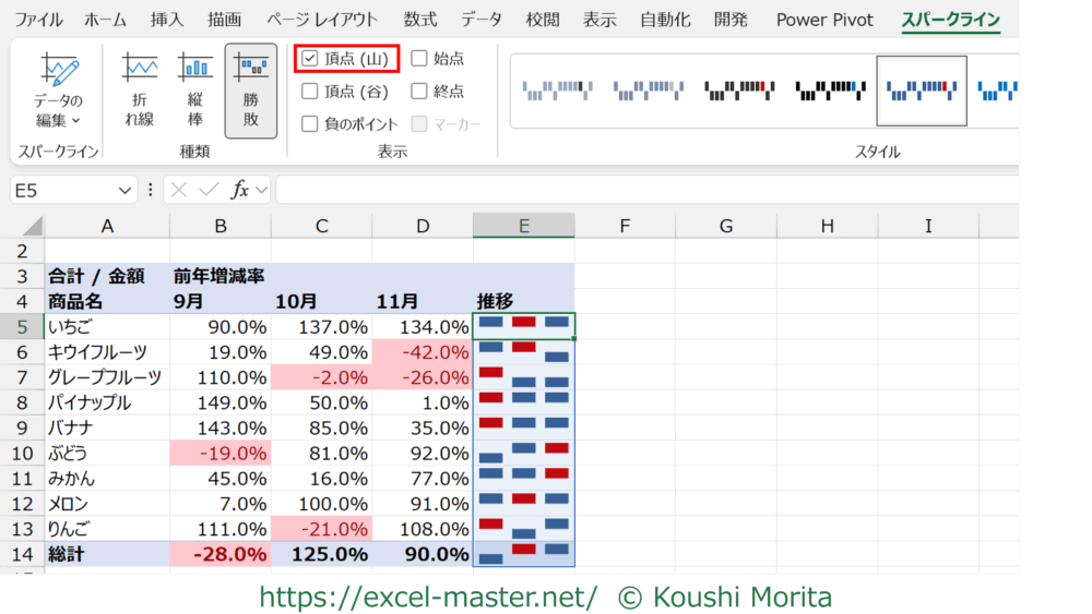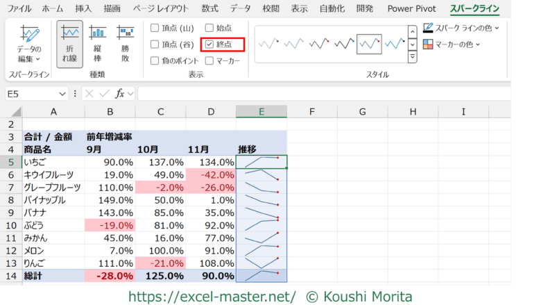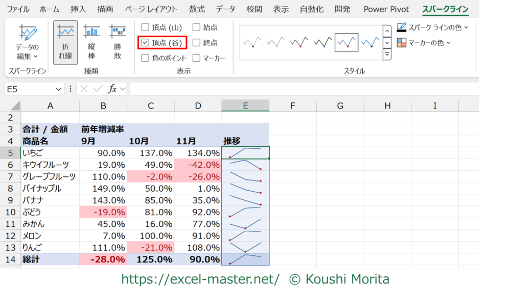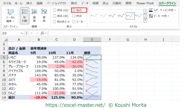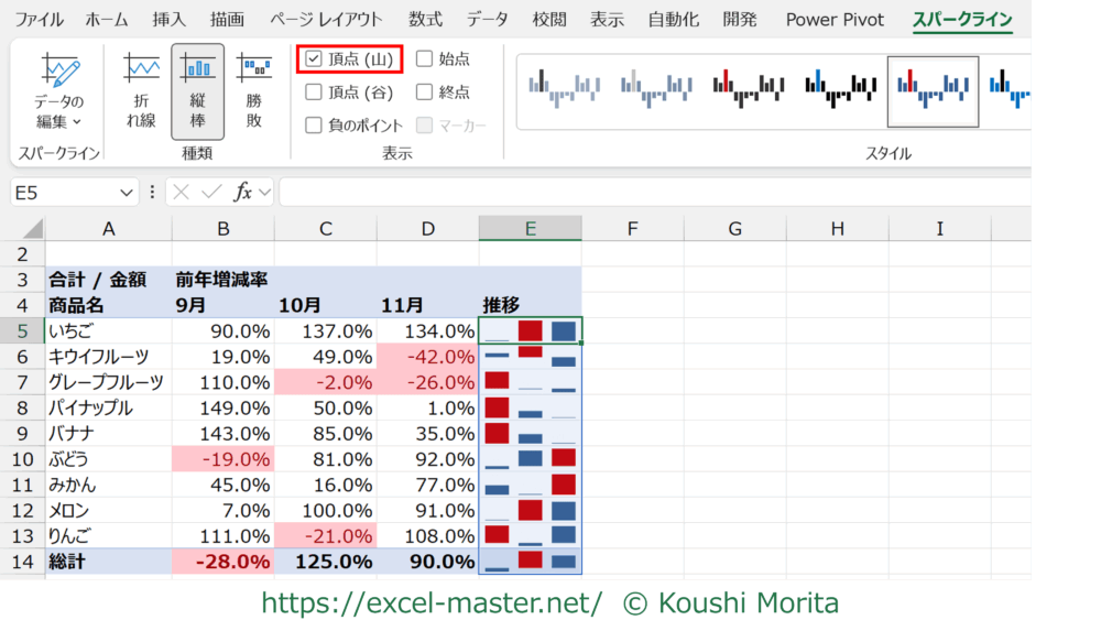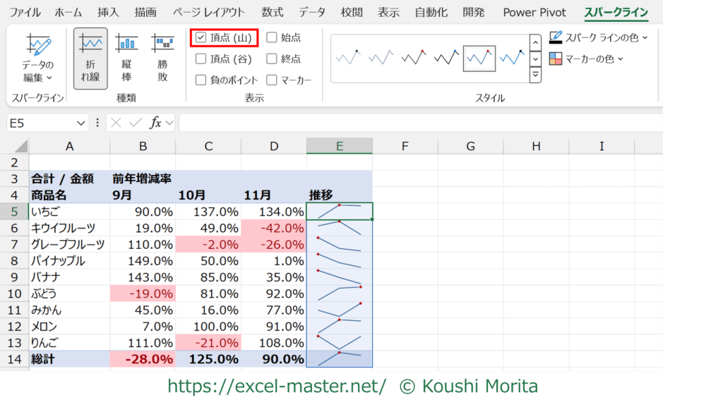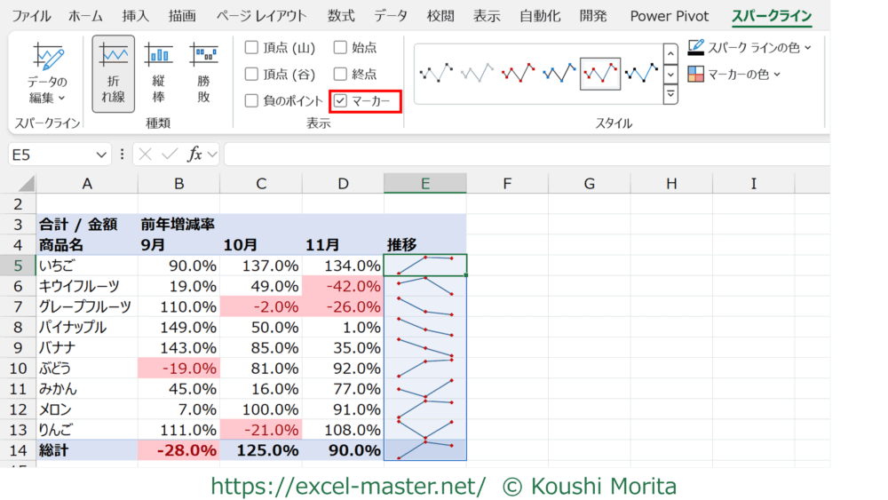 各行の元データの最大値に該当するスパークラインへマーカーが表示されました。