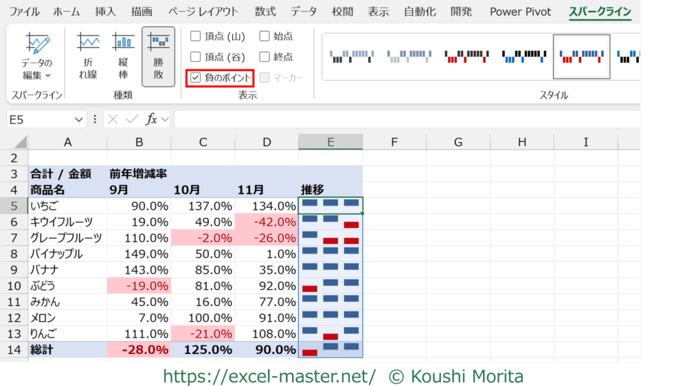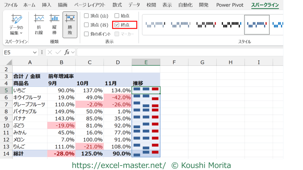 勝敗スパークラインは正の値か負の値かをシンプルに表現しているため、この強調表示をしても実質的な意味なし(元データの終点に該当する部分へ色付け自体はされてしまう)。