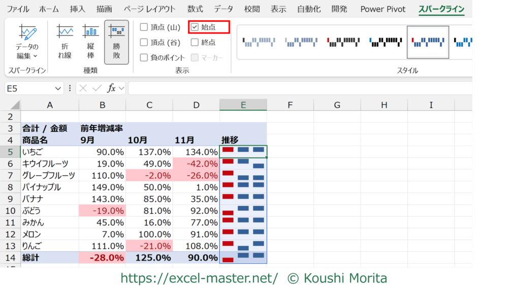 勝敗スパークラインは正の値か負の値かをシンプルに表現しているため、この強調表示をしても実質的な意味なし(元データの始点に該当する部分へ色付け自体はされてしまう)。