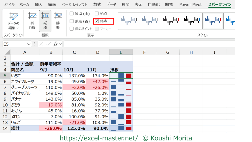 スパークラインの強調表示可能なポイントについて、それぞれ順番に解説します。
