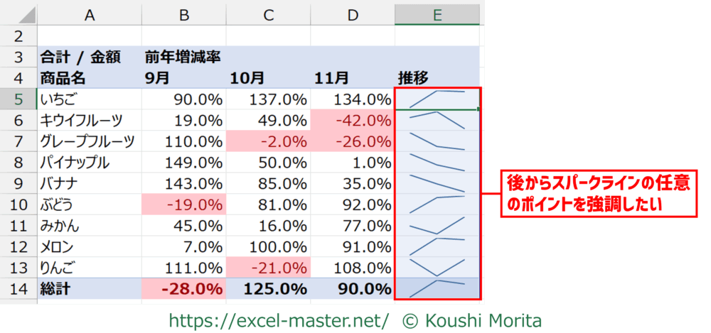 しかし、スパークラインの元データが多い場合、どの部分がポイントか強調したいケースもあります。