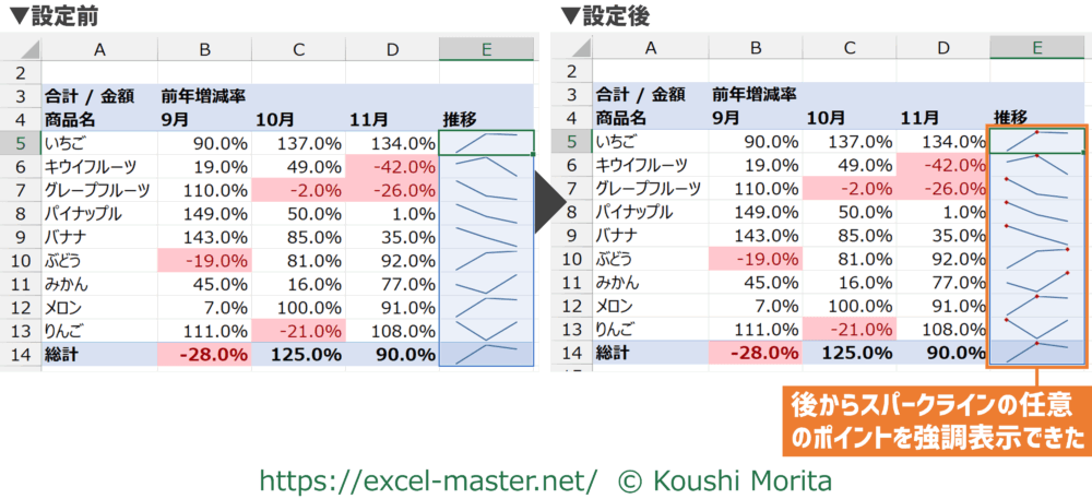 設定後にスパークラインの特定のポイントを強調したい場合に活用しましょう。