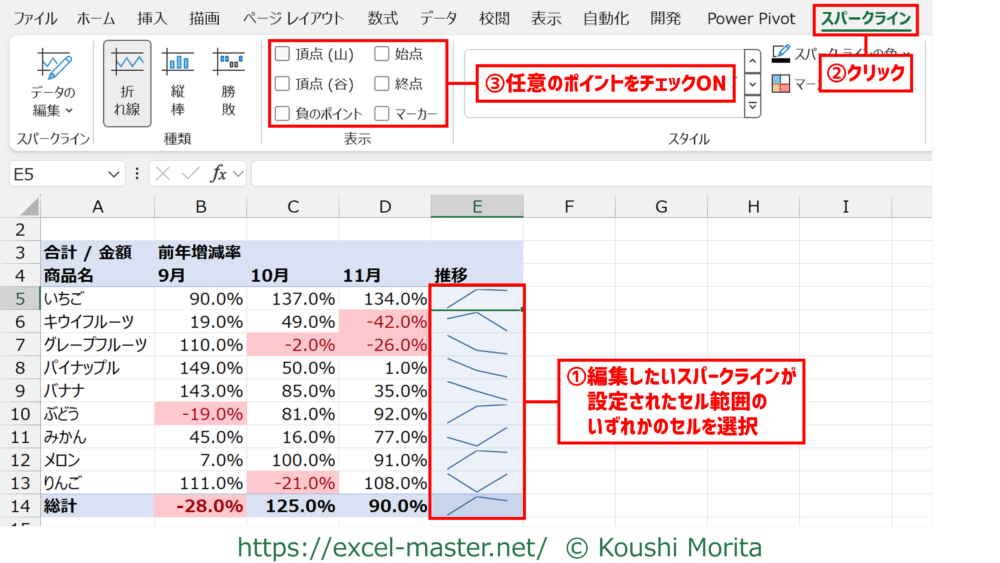 「表示」グループの各ポイントは、スパークラインの任意のポイントを後から強調表示できる機能です。