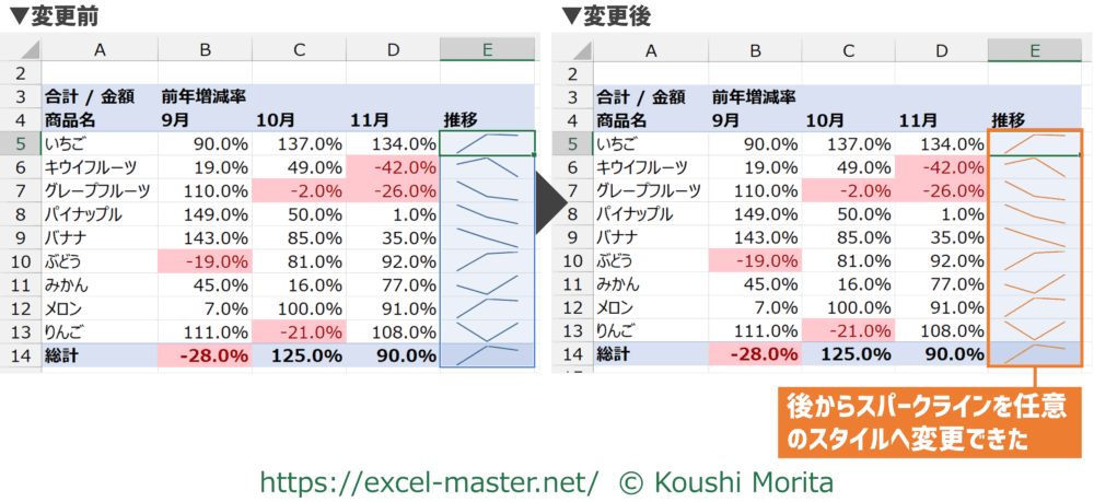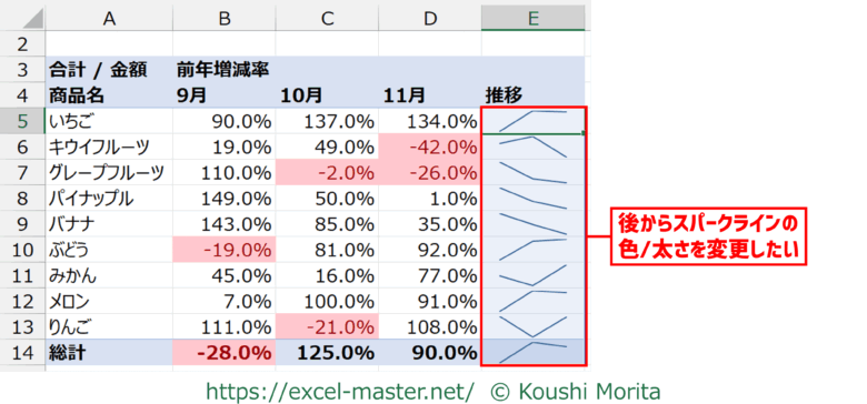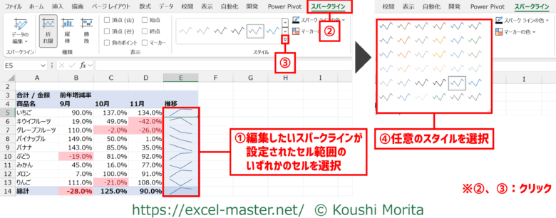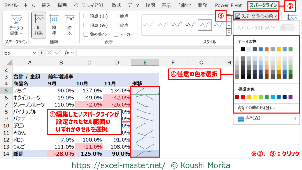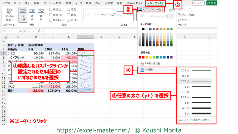 設定後にスパークラインを任意の色/太さに変更したい場合に活用しましょう。