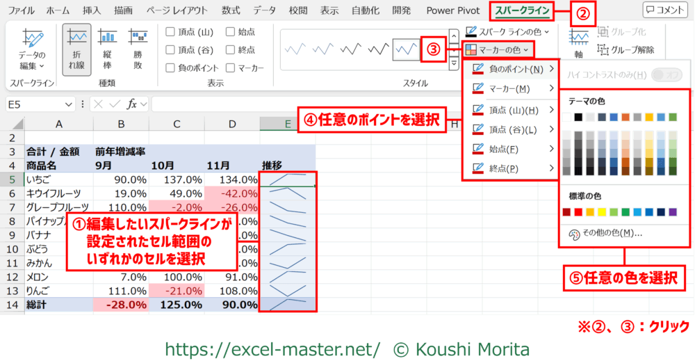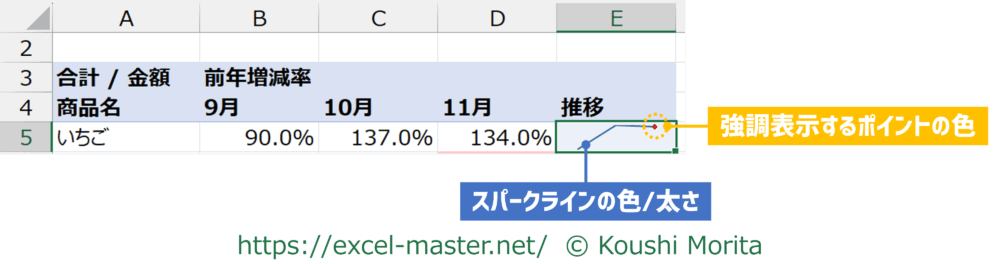 スタイルで一括変更ではなく、スパークラインの色/太さのみ、強調表示するポイントのみ等、個別に変更することも可能です。