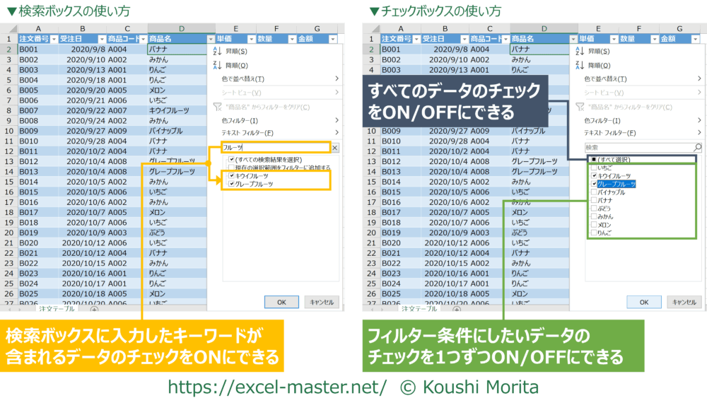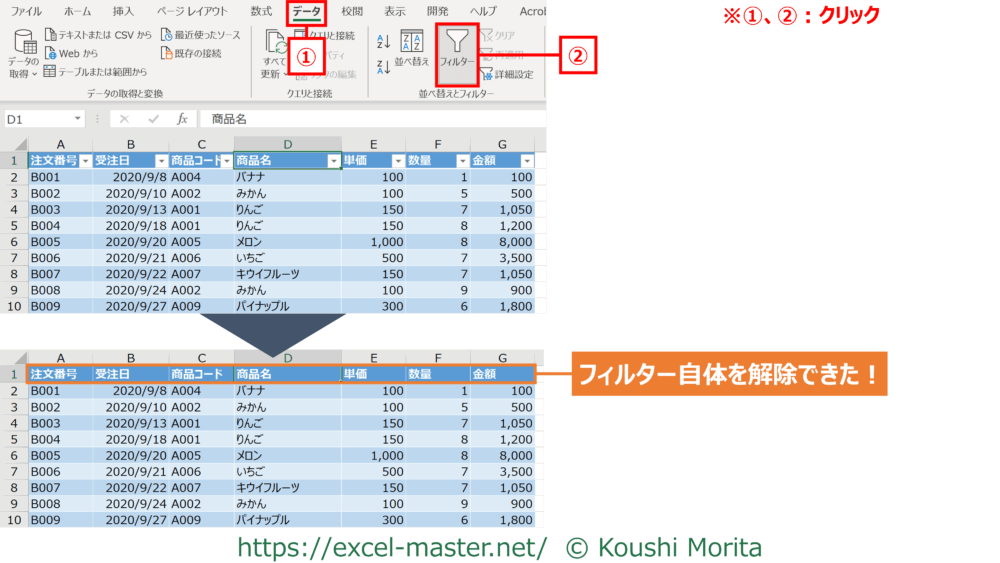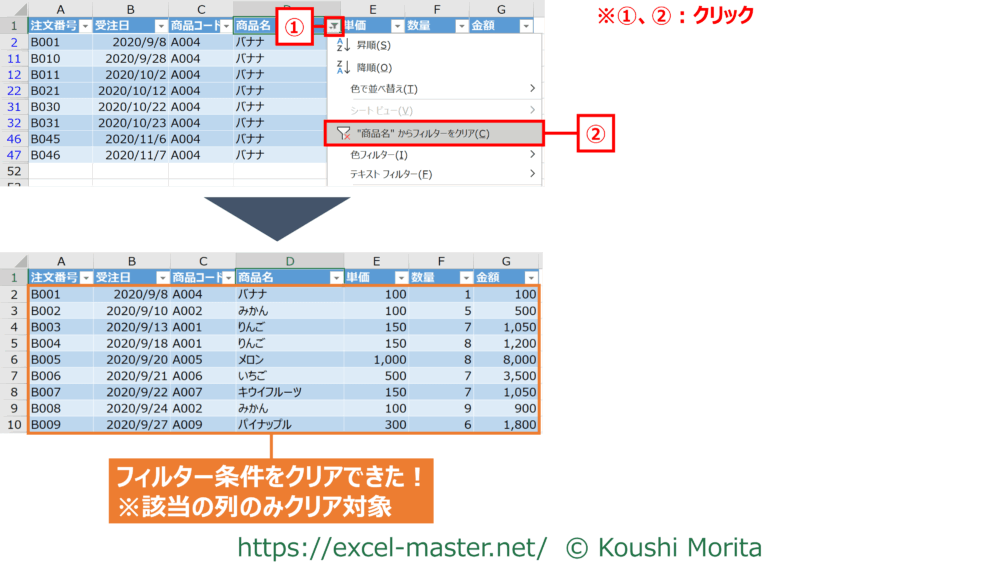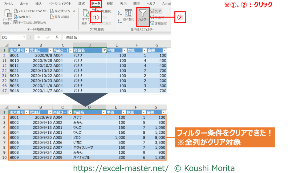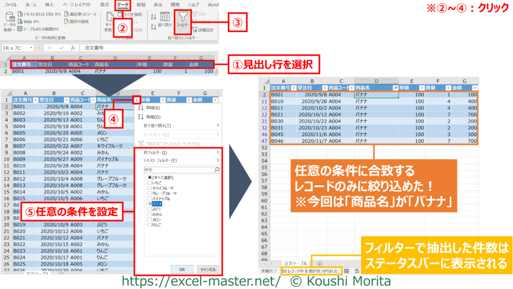 今回は「商品名」が「バナナ」を条件にフィルターを設定します。