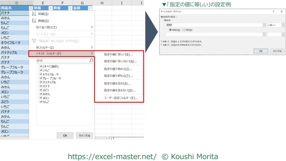 文字列データが含まれる列の場合は「テキストフィルター」が表示されます。