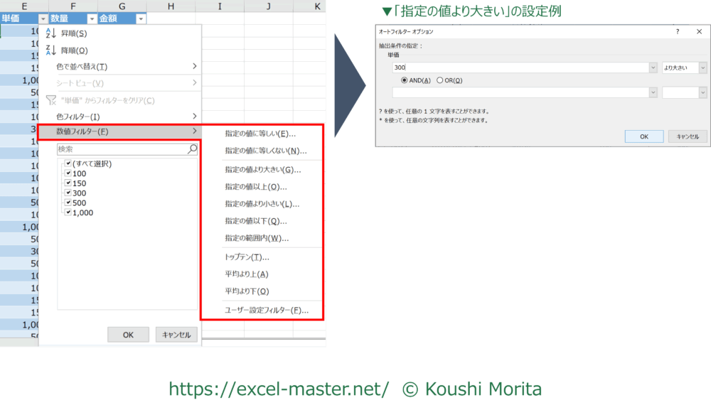 「指定の値と等しい」以外の条件でフィルターを設定したい場合に活用しましょう。