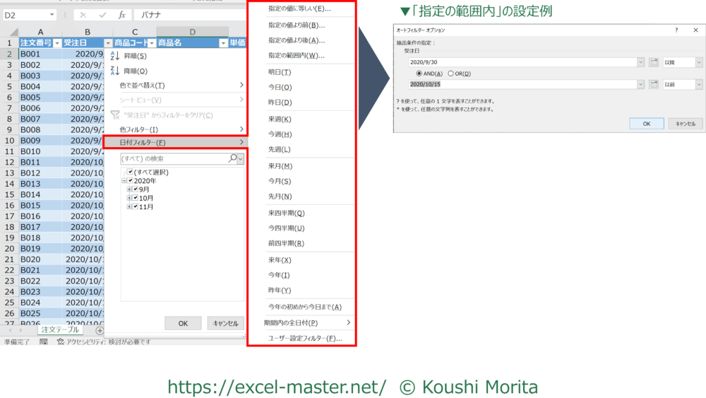 【方法2】テキストフィルター/数値フィルター/日付フィルター