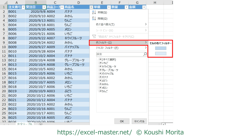上記2種類は列内の各セルの「値」を対象にしたフィルターでしたが、「色」でもフィルターを設定することが可能です。